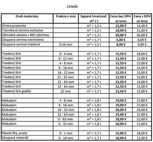 Predaj a dovoz všetkých druhov sypkých stavebných materiálov zeminy, štrku, piesku, makadamu, kameniva, betónovej zmesi a iné.